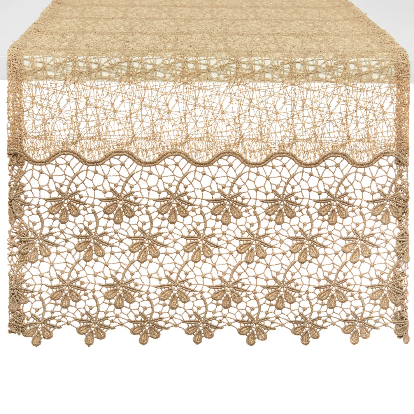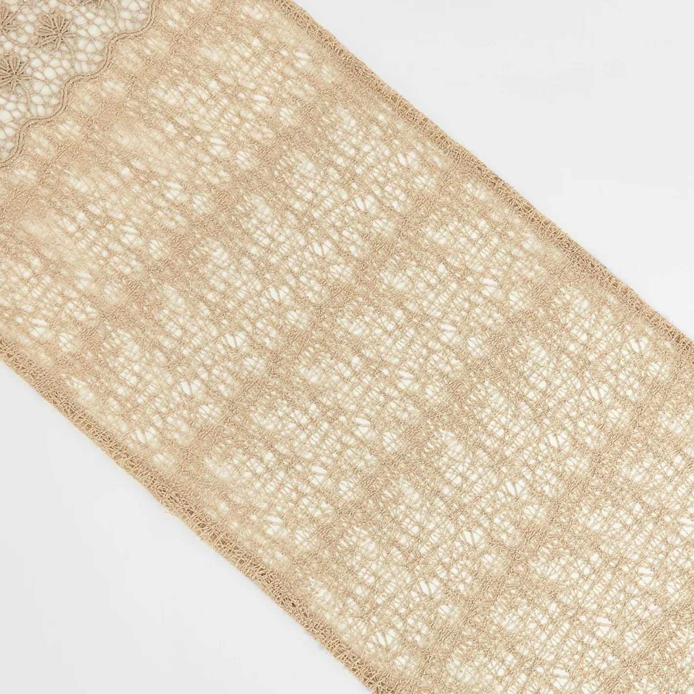 - Runner centrotavola traforato in fili di lurex con intreccio floreale.