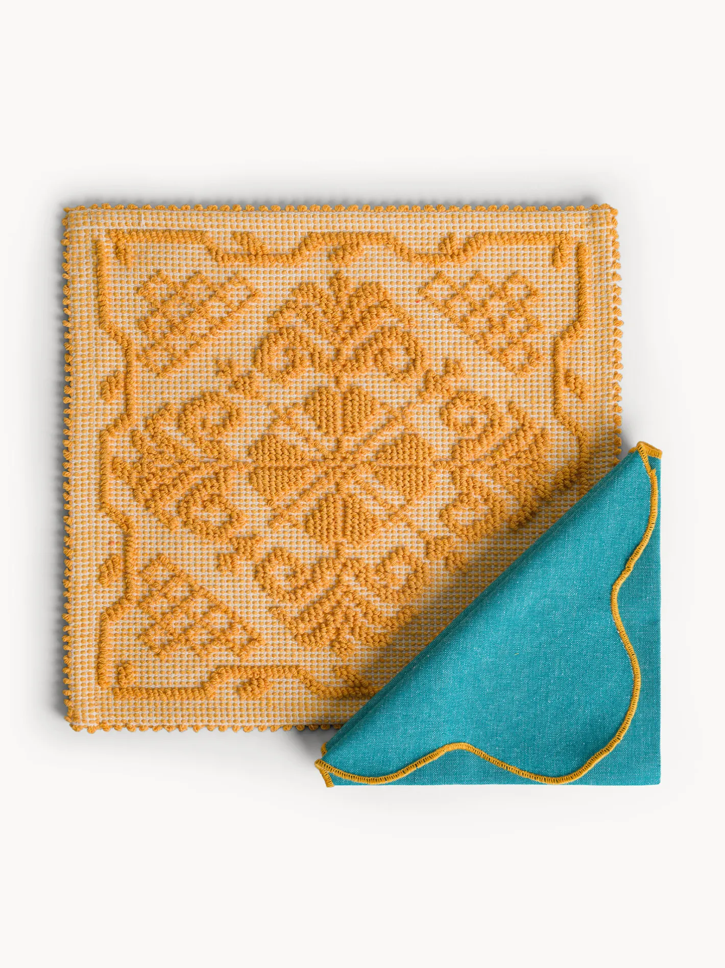 - Elegante tovaglietta sarda in puro cotone, realizzata con l’antica tecnica di tessitura “a pibiones”, conosciuta anche come “a grani”, simbolo della tradizione artigianale della Sardegna. Questo metodo, che richiede grande maestria e precisione, dona al tessuto rilievi raffinati e motivi ricchi di dettagli. Disponibile in una palette di 12 colori.