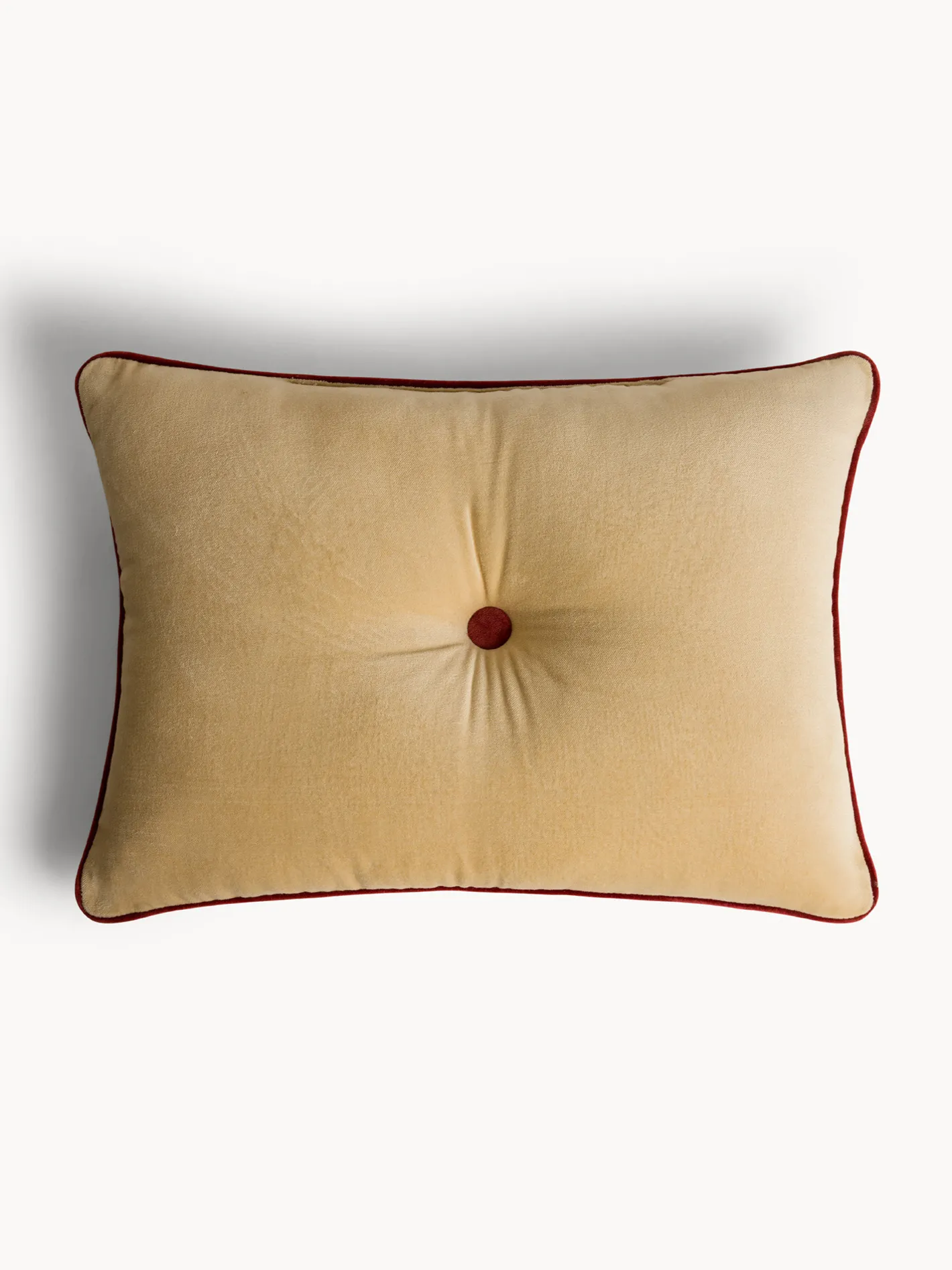 - Cuscino in velluto di cotone arricchito da un bottone centrale e piping a contrasto, per un elegante dettaglio decorativo. La federa è rimovibile e lavabile, con imbottitura interna inclusa per massimo comfort. Chiusura con zip. Disponibile in 2 colori.