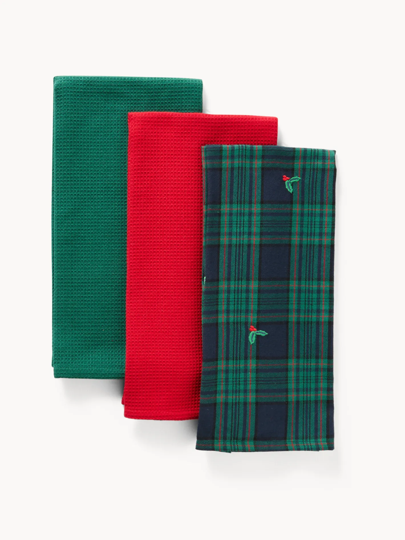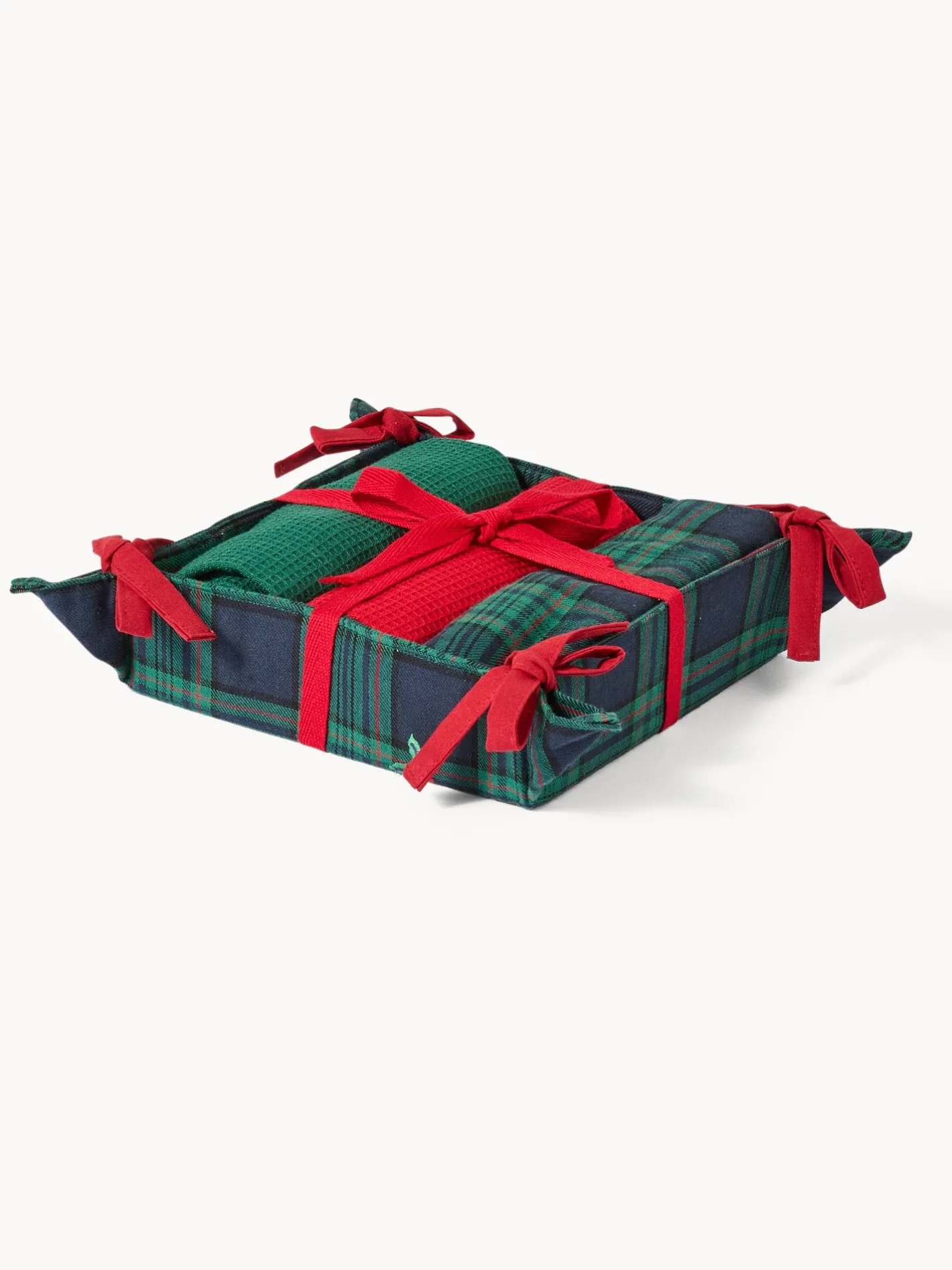 - Cestino con set di 3 strofinacci. Tutto in puro cotone, il set di 3 strofinacci si compone di uno strofinaccio tartan con ricami agrifogli e due con trama a nido d’ape tinta unita. Una volta rimossi gli strofinacci, il cestino diventa un grazioso componente natalizio per la tavola.