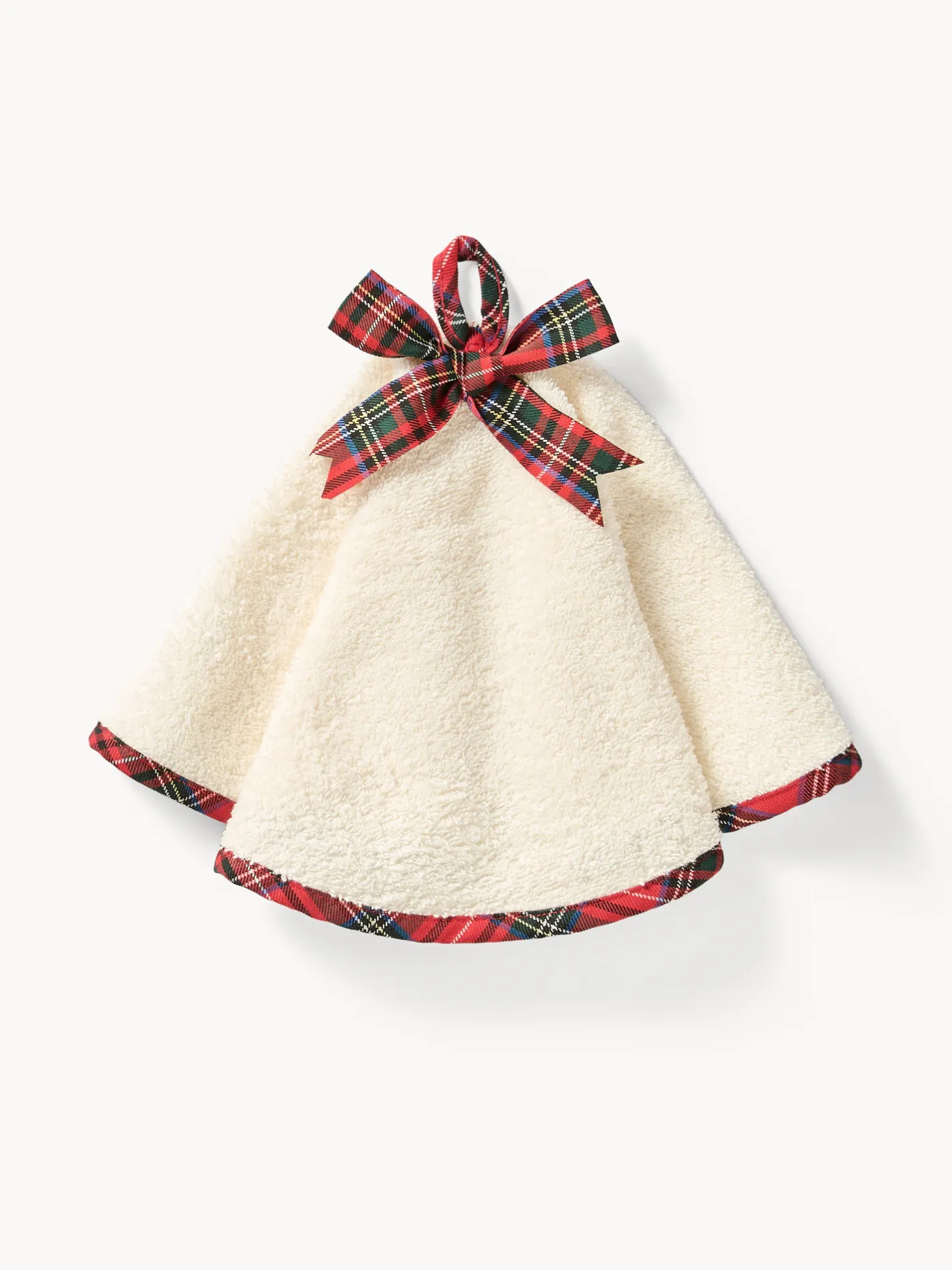 - Strofinaccio in spugna di cotone con fiocco. Realizzato in morbida spugna di puro cotone, questo strofinaccio combina comfort e alta capacità assorbente. Ideale per asciugare le stoviglie e semplice da lavare, aggiunge subito un tocco festoso alla cucina grazie al delicato fiocco in tartan che richiama il raffinato bordo.