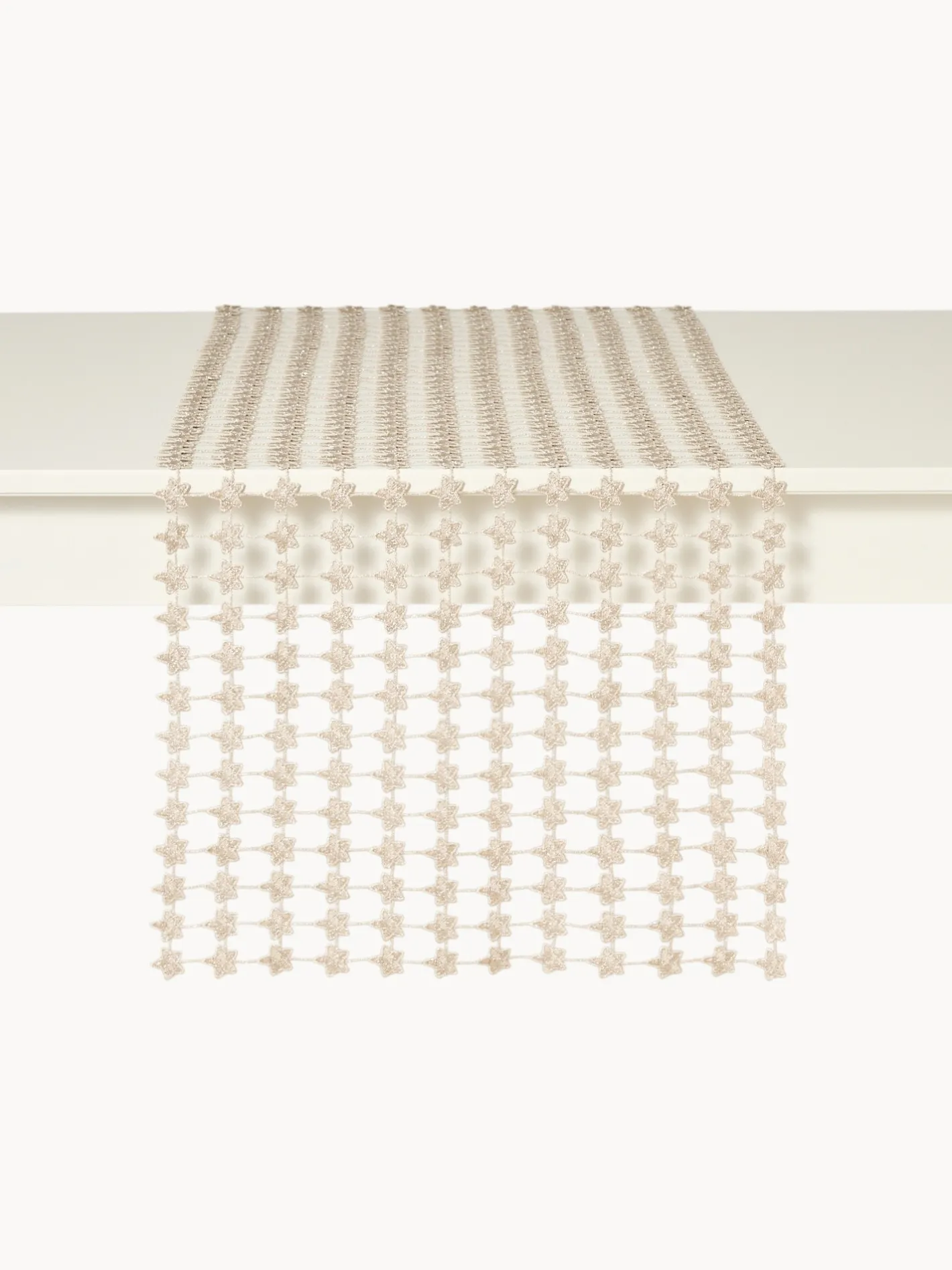 - Runner traforato in lurex argento. Realizzato intrecciando fili di lurex color argento, questo runner è il componente ideale per portare il glam e lo sfarzo nelle festività.