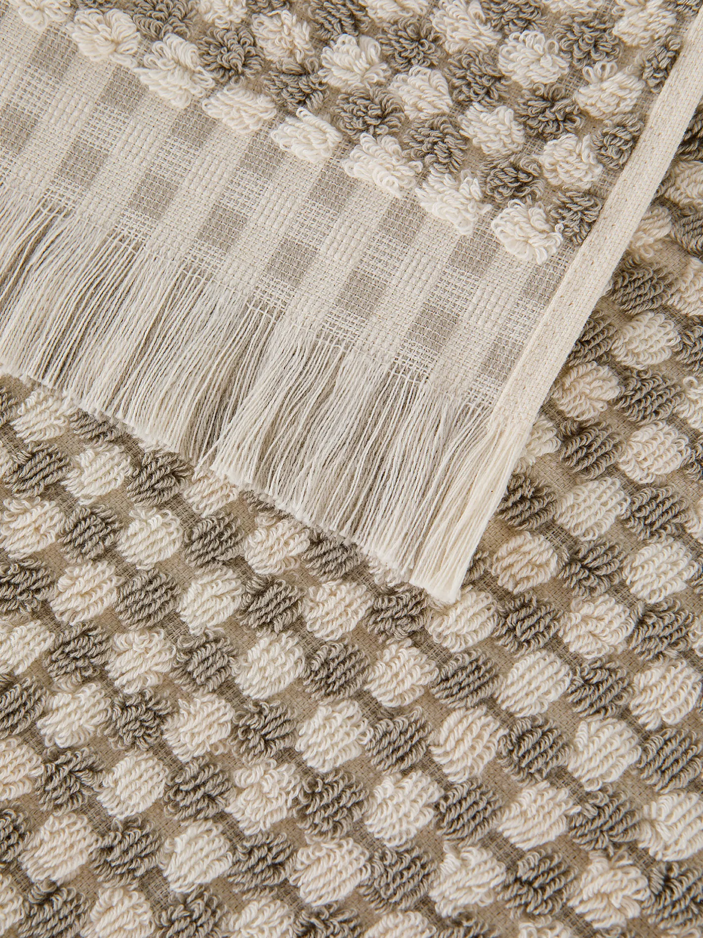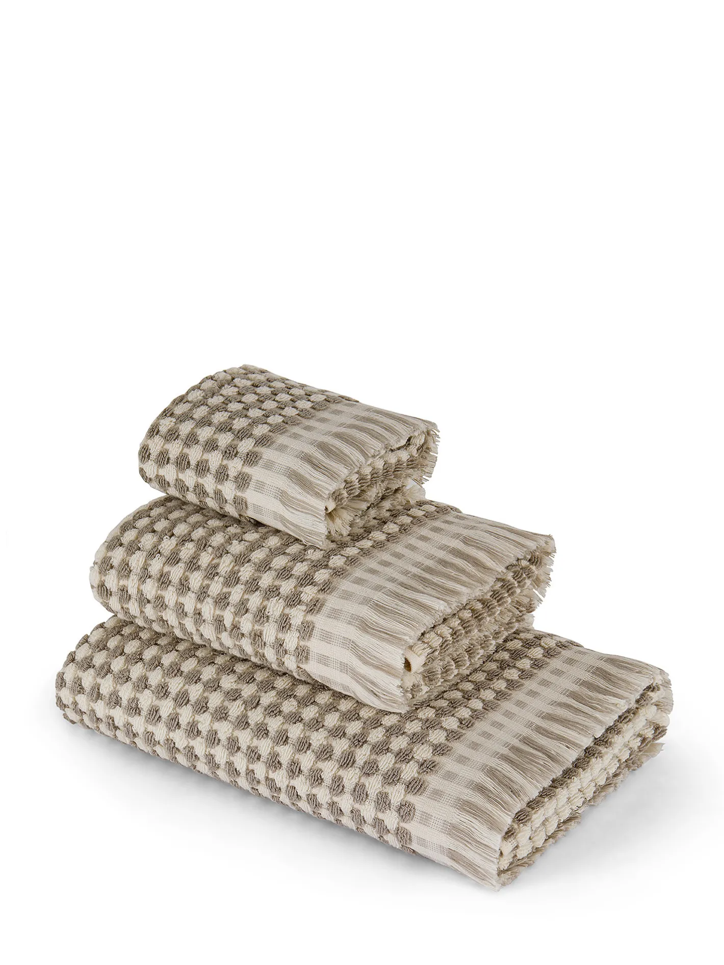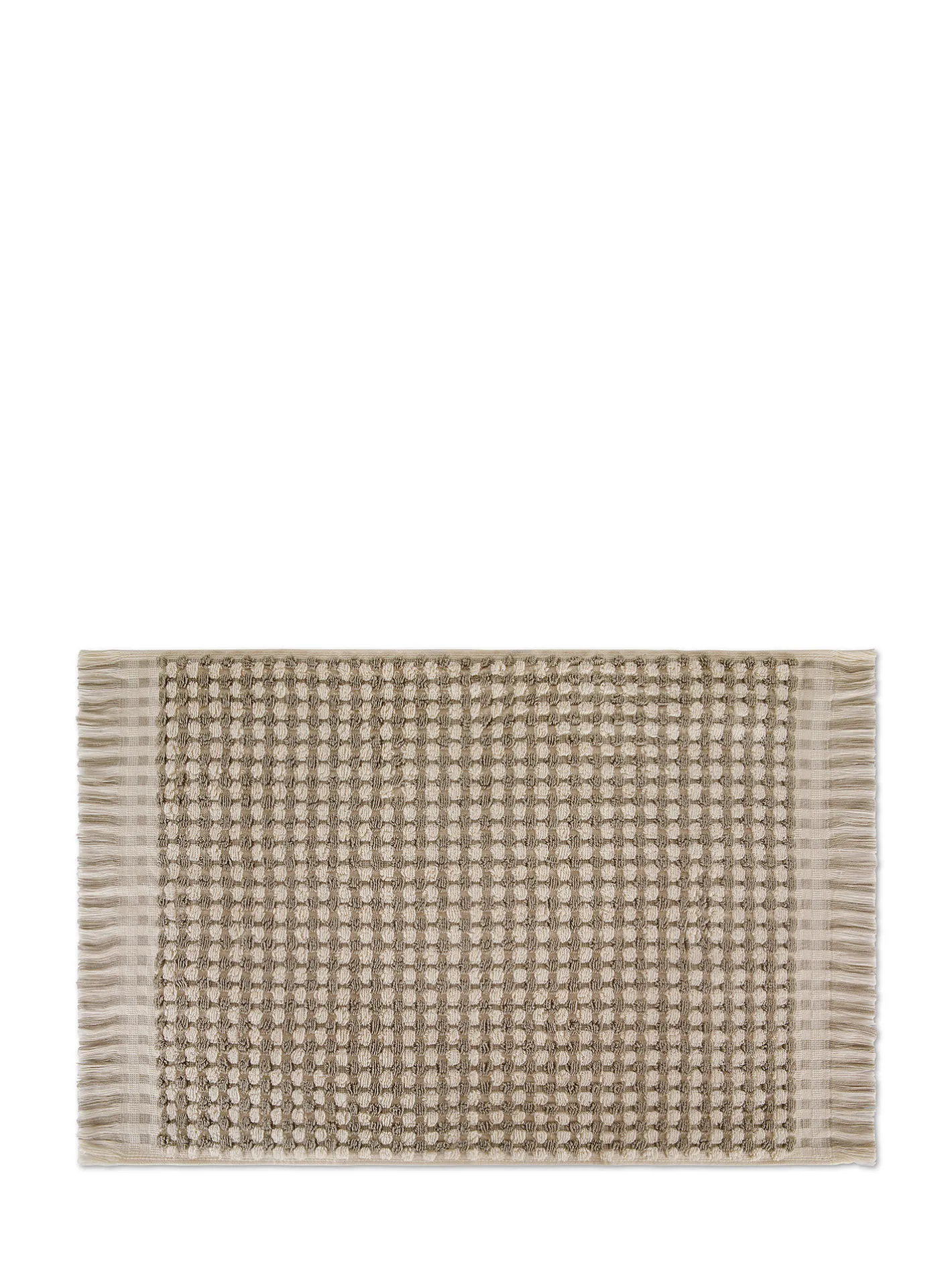 - Asciugamano viso Thermae in puro cotone. Trama bicolore motivo scacchiera e bordo con frange. Grammatura: 450gr/m².