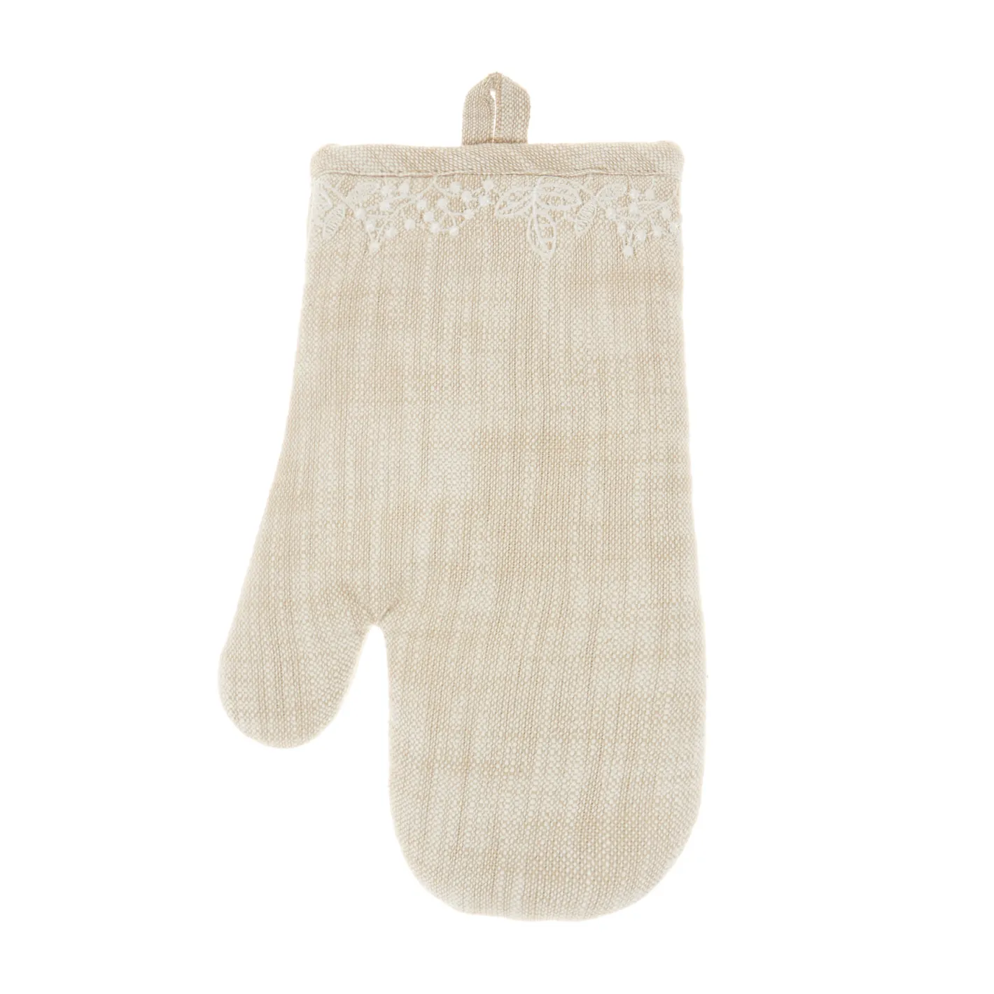 - Guanto da cucina in puro cotone mélange a trama fiammata con ricami sul bordo. Imbottitura in poliestere.