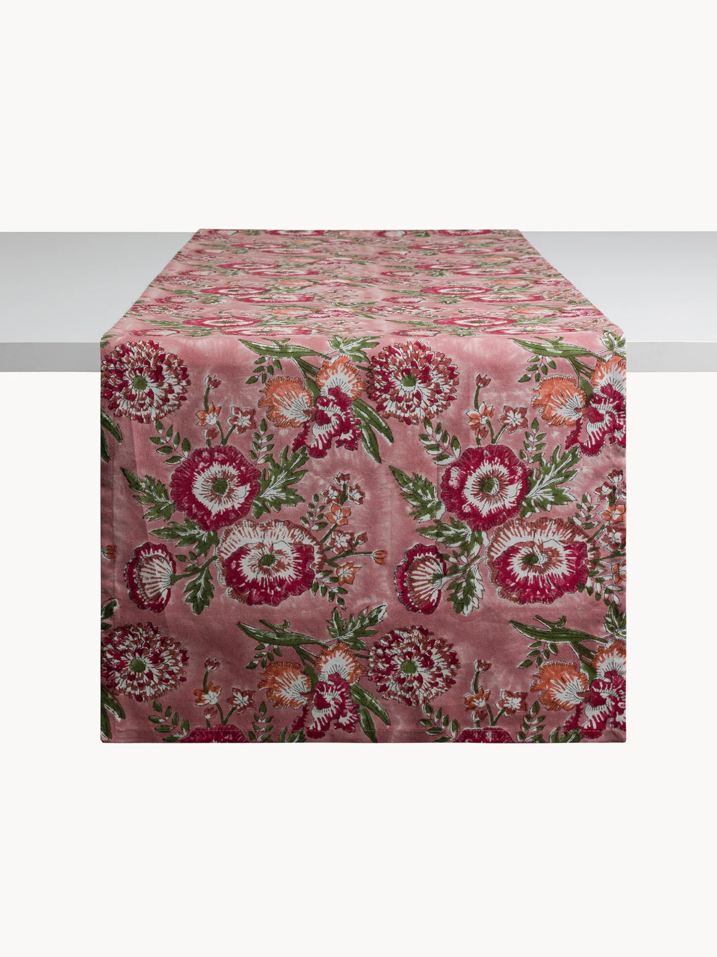- Runner in puro cotone con stampa block print floreale. La tecnica di stampa block print è una tecnica molto antica, tipica dell’Asia, inizialmente utilizzata per tessuti di pregio destinati alla nobiltà. Gli artigiani creano dei blocchi di legno intarsiati che, intinti nel colore, vengono impressi più volte nella stoffa. Si creano così disegni unici, imperfetti ed autentici.