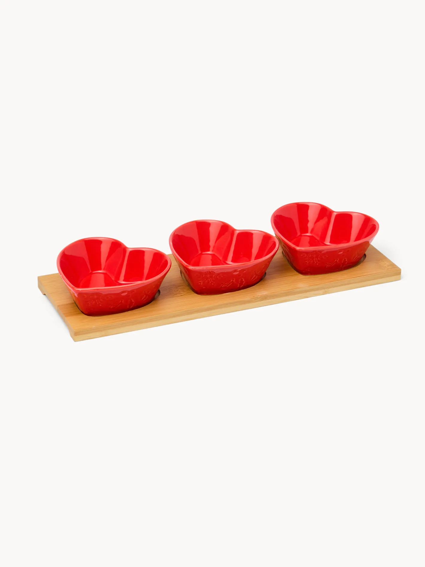 - Antipastiera legno di bamboo con 3 coppette porcellana cuore rosso.