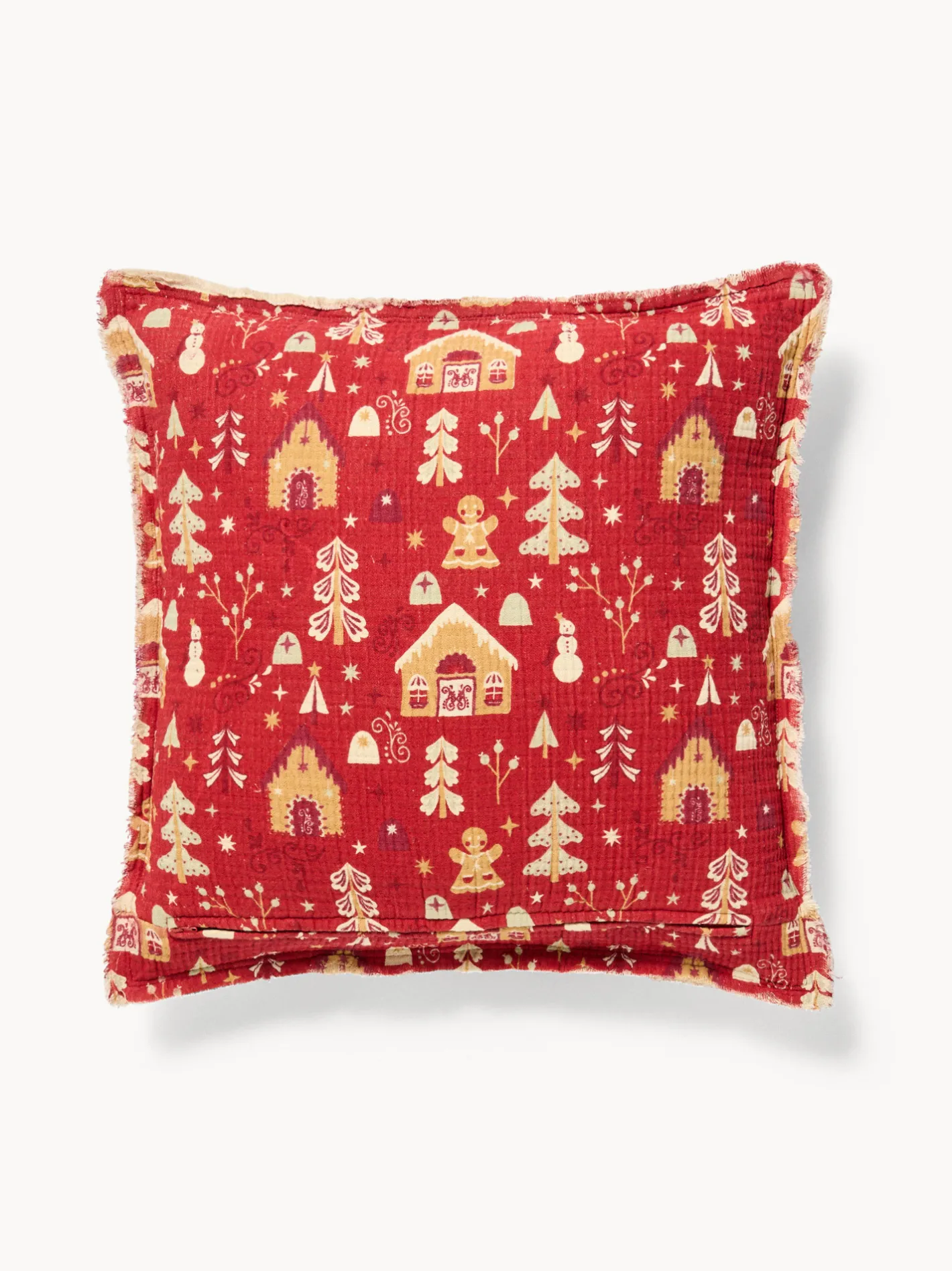 - Cuscino 50×50 in garza di cotone con frangette. Porta lo spirito del natale nel tuo soggiorno con il cuscino in morbida garza di cotone, arricchito da graziose frangette nei bordi laterali. La federa è rimovibile e lavabile, con imbottitura interna inclusa. Chiusura con zip.