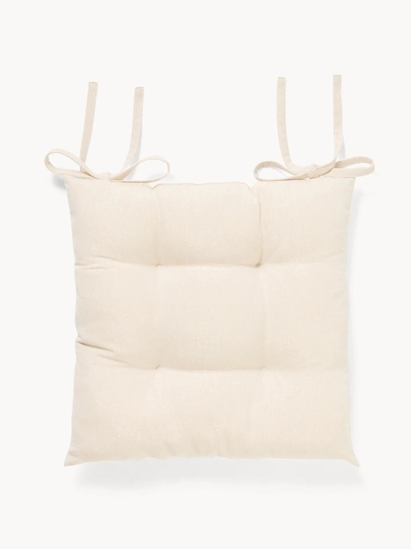 - Cuscino da sedia con lacci in cotone e lurex. Realizzato in pregiato cotone arricchito da fili di lurex color champagne, questo cuscino da sedia unisce comfort e raffinatezza. Morbido e avvolgente, assicura una seduta confortevole, mentre il tessuto brillante dona un tocco di eleganza e fascino alla tavola, rendendo ogni momento conviviale ancora più speciale. I pratici lacci permettono di fissarlo saldamente alla sedia, garantendo stabilità e praticità d’uso.