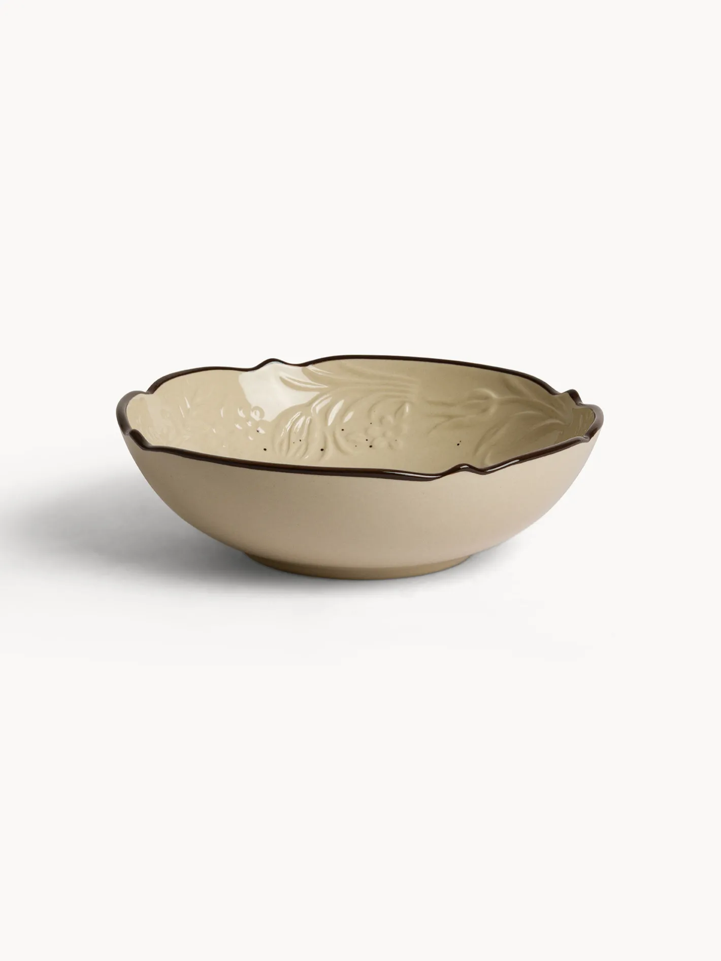 - Elegante piatto fondo in stoneware con raffinato filo marrone sul bordo, disponibile anche nella versione piatto piano e piatto frutta coordinati. Realizzati con materiali resistenti e di qualità, uniscono semplicità e stile, rendendo la tavola armoniosa e accogliente in ogni occasione. La linea essenziale e il dettaglio del bordo marrone si adattano perfettamente a mise en place moderne e tradizionali, ideali sia per l’uso quotidiano che per momenti speciali.