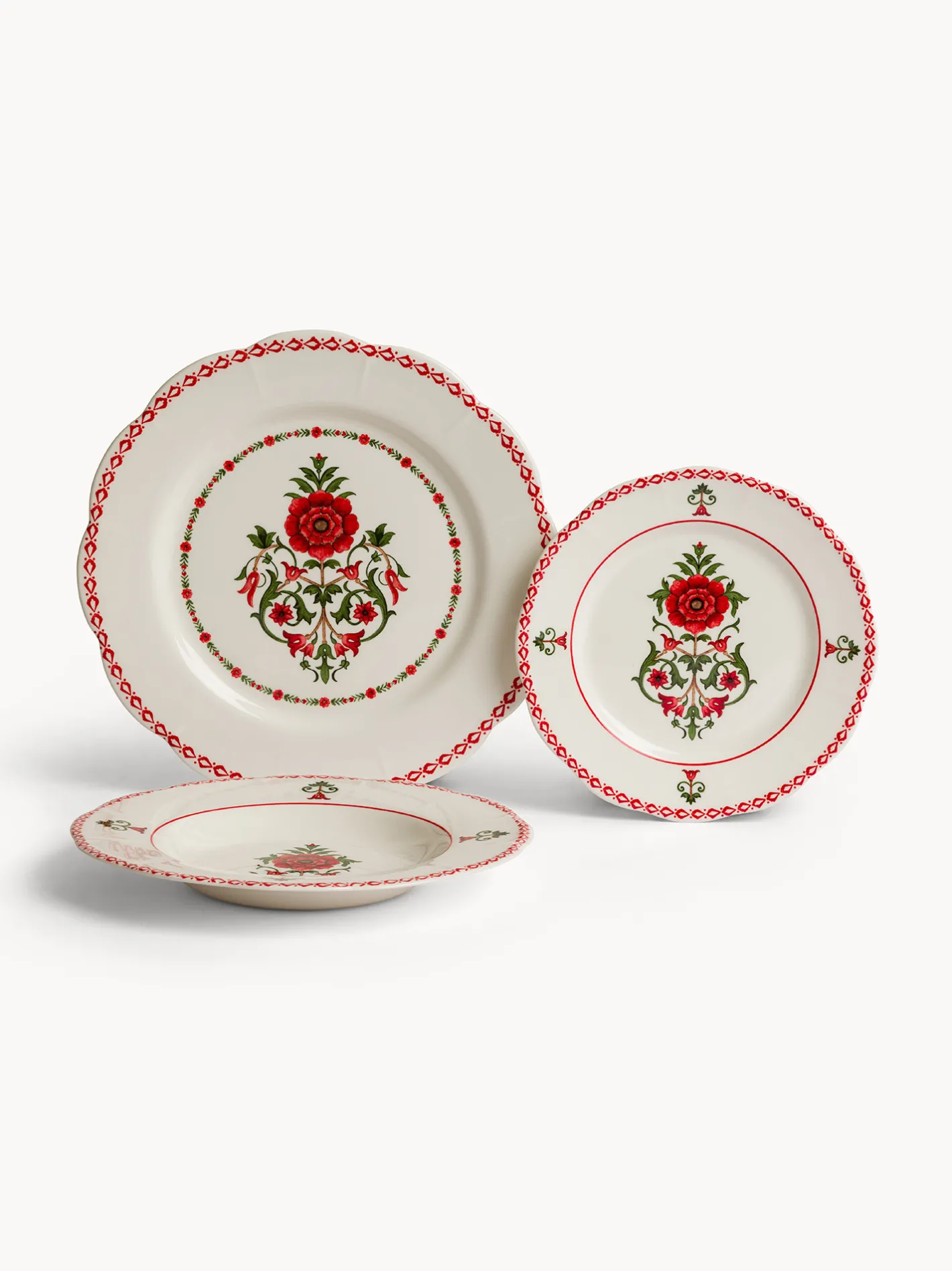 - Set da 18 piatti in ceramica decorati con raffinato motivo a fiore rosso, composto da 6 piatti piani da 27 cm, 6 piatti fondo da 23 cm e 6 piatti frutta da 20 cm. Perfetto per apparecchiare la tavola con stile, questo servizio unisce eleganza, praticità e armonia cromatica, rendendo ogni pasto un’occasione speciale. La ceramica di alta qualità garantisce resistenza e facilità di pulizia, ideale sia per l’uso quotidiano sia per momenti conviviali o cene più ricercate. I dettagli floreali aggiungono un tocco scenografico e raffinato, e il set può essere completato con altri accessori coordinati della stessa collezione per creare una mise en place elegante, accogliente e armoniosa.