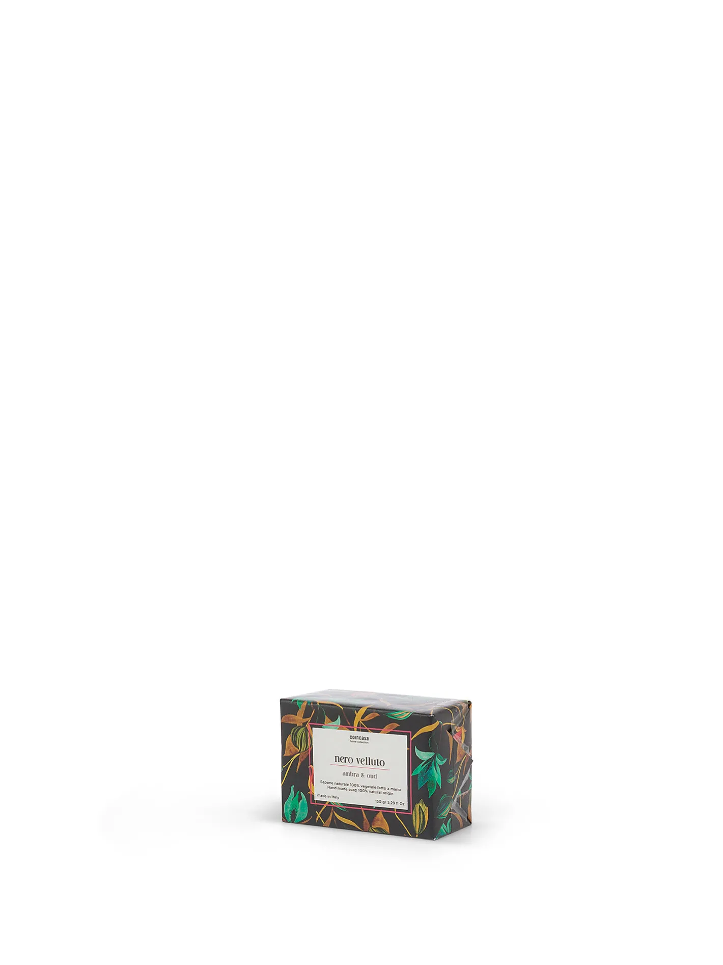 - Saponetta naturale vegetale 150 gr – NERO VELLUTO Fragranza legnosa ed elegante caratterizzata dal perfetto mix di note legnose e Oud Cambogiano, ammorbidite dal miele. Finale esaltante di ambra grigia.
