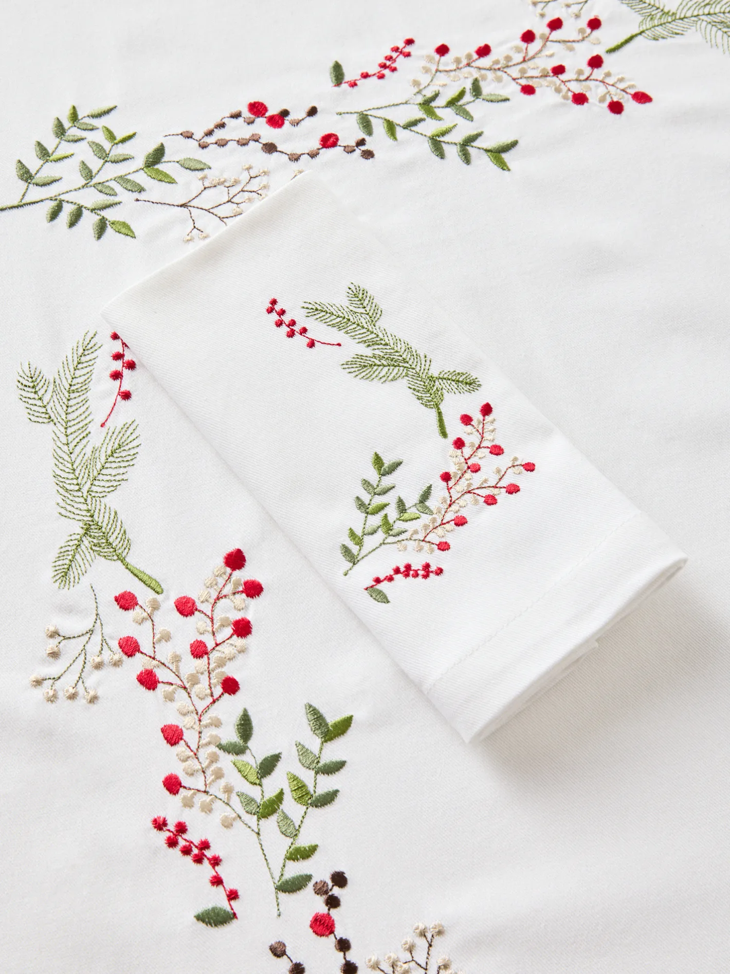 - Tovaglia in puro twill di cotone con doppio ricamo piazzato agrifoglio.Elegante e raffinata, porta un tocco di magia e calore festivo alla tavola, trasformando ogni pasto in un momento speciale.