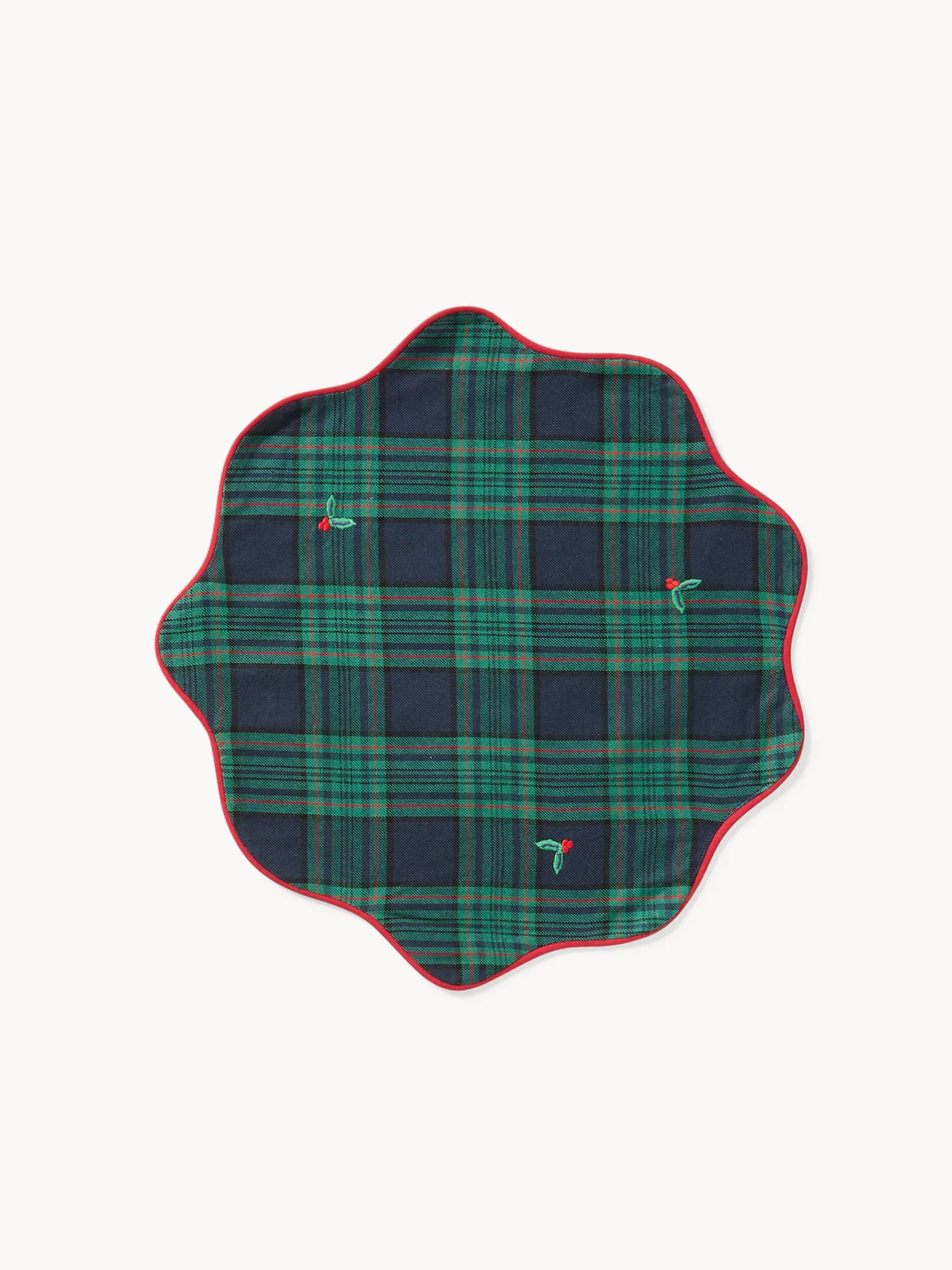 - Tovaglietta tartan in twill di cotone con ricami agrifoglio e bordi smerlati. La tovaglietta è in twill di cotone tinto filo motivo tartan con ricami agrifoglio e overlock a contrasto. Perfetta per portare l’atmosfera calorosa e confortevole delle feste in tavola.